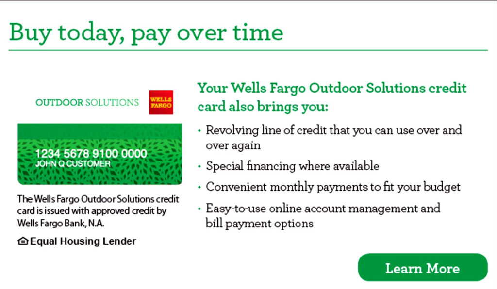Buy today, pay over time with the Wells Fargo Outdoor Solutions® credit card, issued with approved credit by Wells Fargo Bank, N.A.