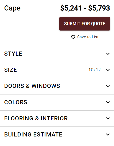 Firstly, let us disclose that our 3D shed builder is first and foremost a visual design aid. While we strive to make it as accurate as possible, pricing may vary depending on the details. However, as you make your way through the process and select your customization options, you will be given a running estimate that we hope will help you get a better idea of what you may be looking at when it comes time to submit for a quote. Keep in mind that delivery costs, taxes, and other adjustments will all be added into the final quote.