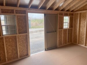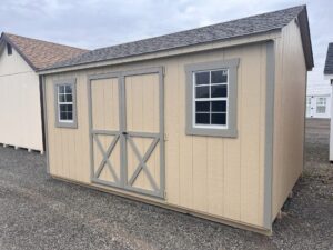 Tan shed with double doors and two windows