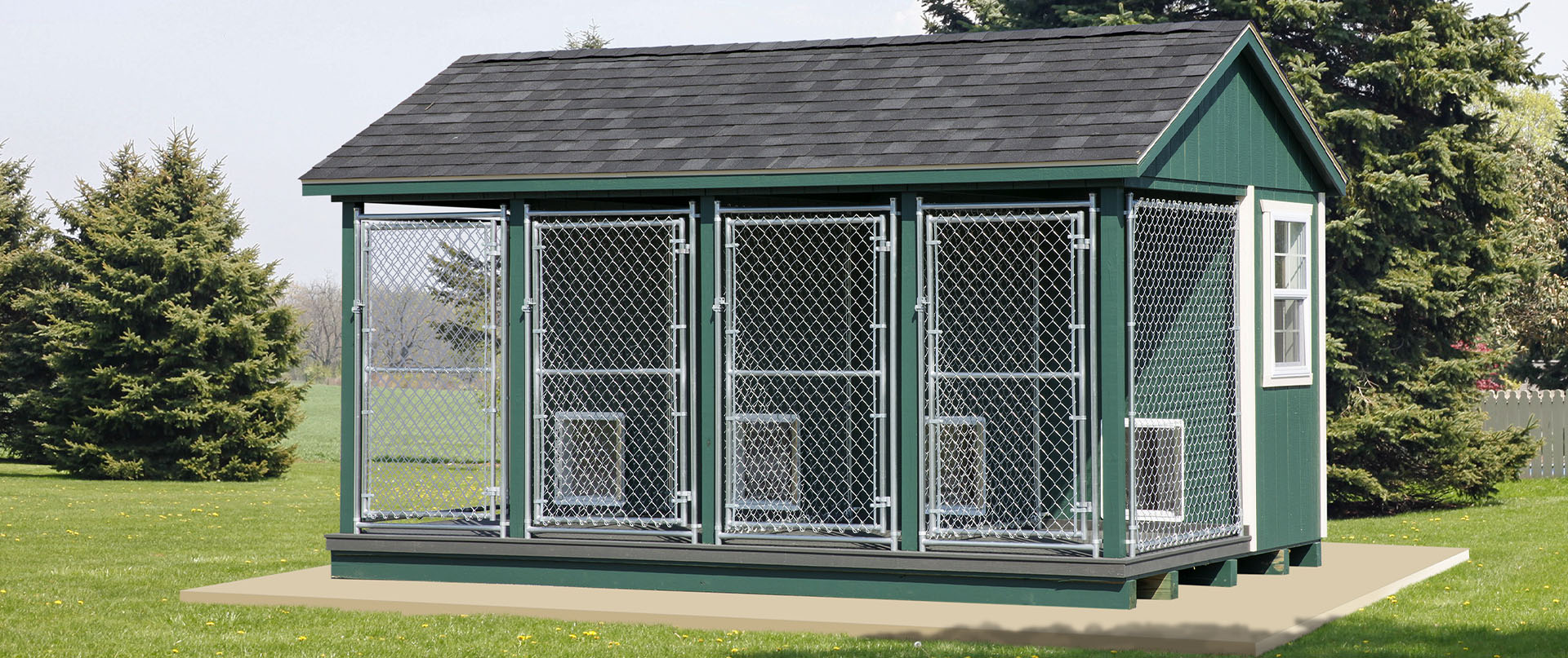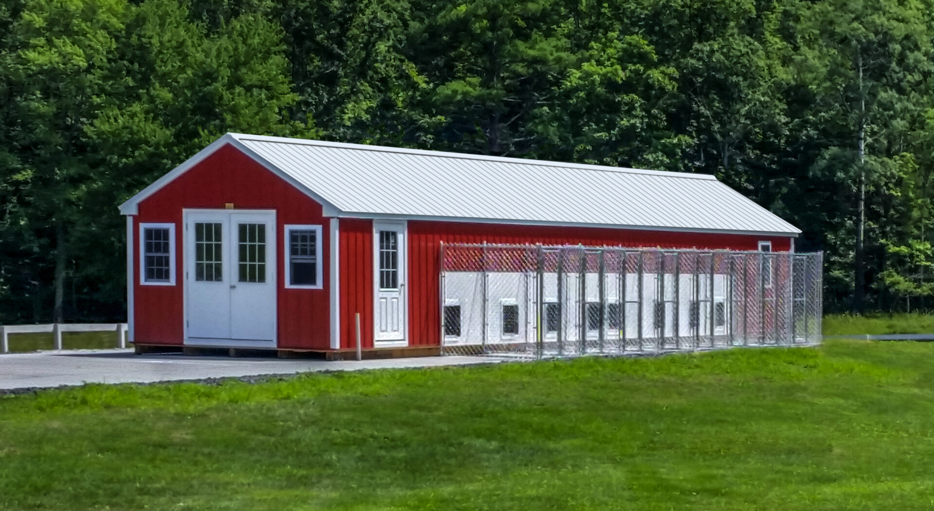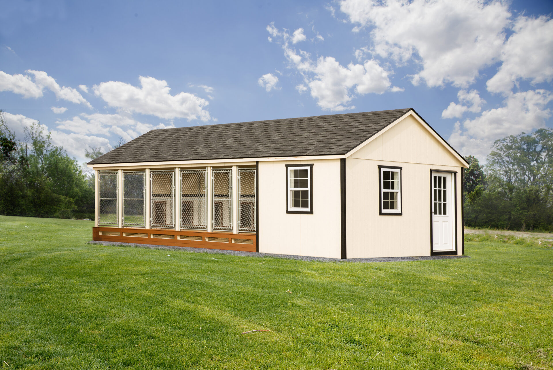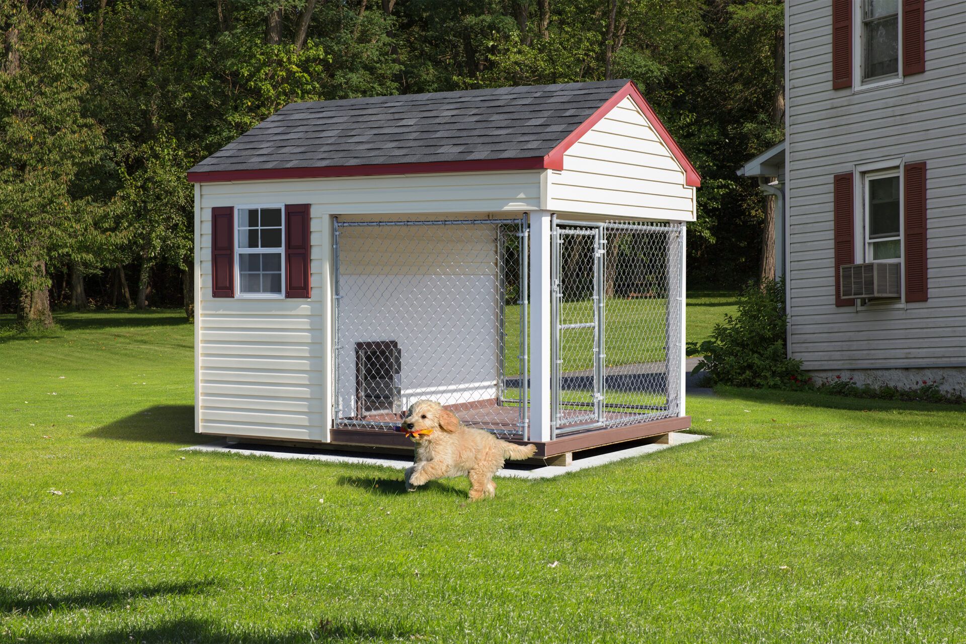 Amish Barn Company Residential and Commercial Dog Kennels feature large plexiglass dog doors, composite decking in the run area and insulation in the walls, floor and ceiling to keep your dogs extra cool. And we now offer Nationwide shipping! Visit our stock page to see what we have available right now for free delivery within 100 miles or stop in to customize yours today, before you end up in the DOG HOUSE!